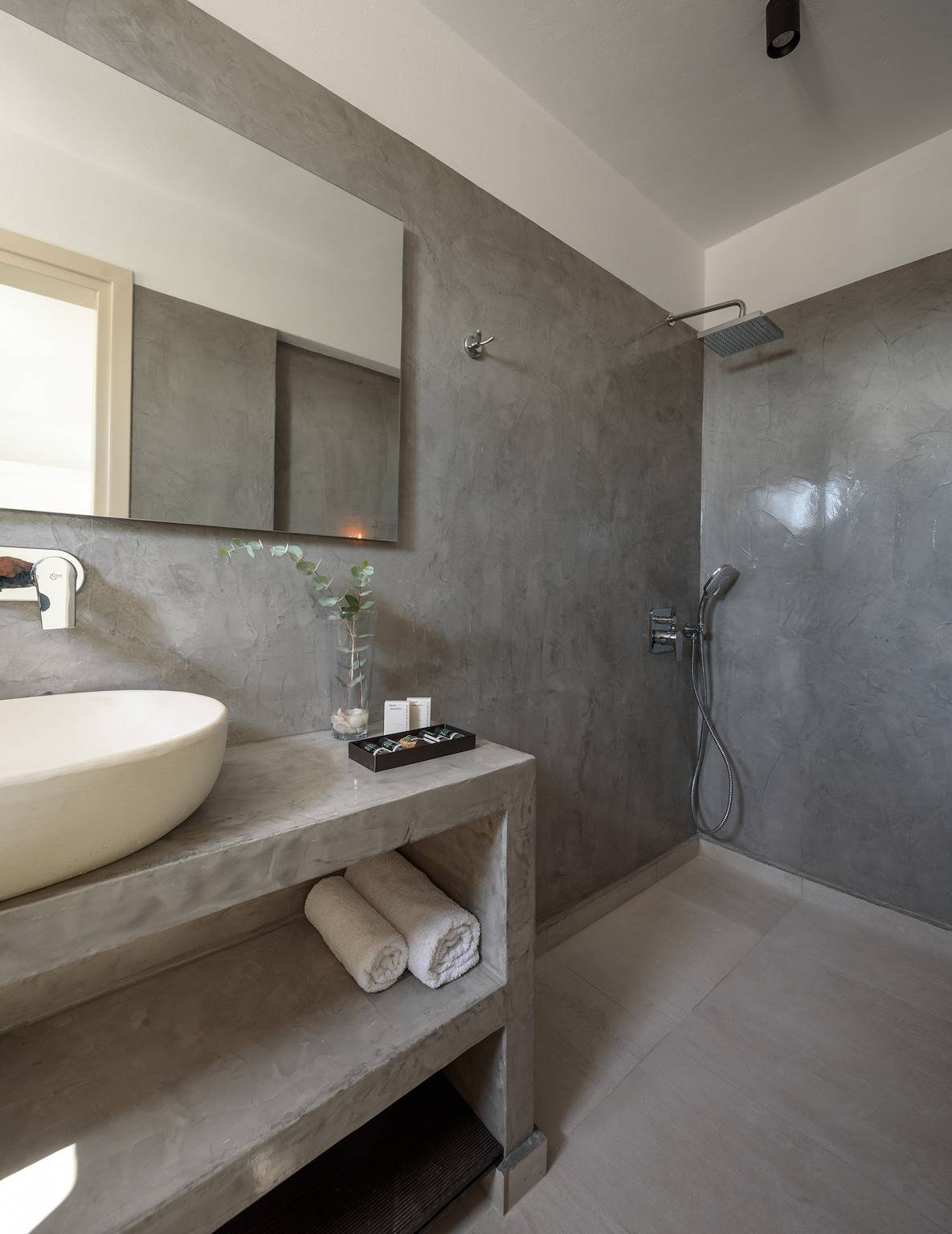 Onirondas villas is a cycladic furnished style house with concrete stylist floors and Our minimal villa consists of 3 bedrooms and 2 bathrooms plus a sitting room. The 3 bedrooms offers 3 double beds and sitting room offers 2 concrete couches and table.In the front yard there is our swimming pool and across the pool you can find a deck with poufs on giving you the chance to relax under the sun after your dive into the pool .Also you can relax in the concrete sofa with a mattress placed on. In the back yard there is a garden area with table and chairs for extra relaxation.